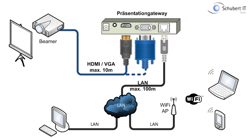 Ein Kunde möchte in seinem Meetingraum einen vorhandenen Beamer neu anbinden. Aufgrund der langen Kabelwege von dem Beamer zur Anschlussdose kommt es immer wieder zu Störungen des Übertragungsweges. Ziel ist es auch, dass die eingesetzten Ipads Ihr Bildsignal auf den Beamer übertragen können. Kurz gesagt der Kunde benötigt eine Schnittstelle/Anbindung zum Beamer die jedes Geräte verwenden kann.
