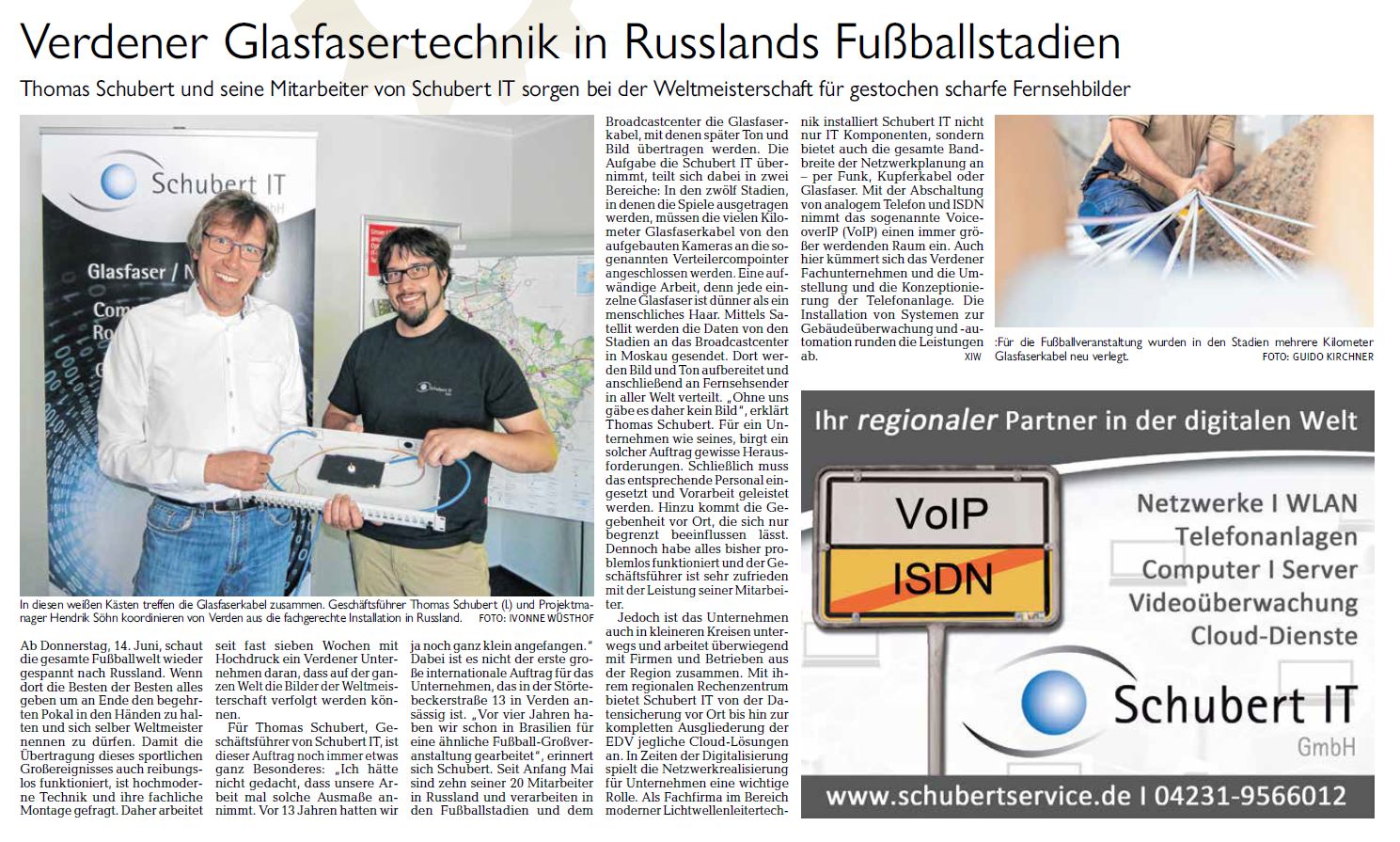 Für Thomas Schubert, Geschäftsführer von Schubert IT, ist dieser Auftrag noch immer etwas ganz Besonderes: Ich hätte nicht gedacht, dass unsere Arbeit mal solche Ausmaße annimmt. Vor 13 Jahren hatten wir ja noch ganz klein angefangen. Dabei ist es nicht der erste große internationale Auftrag für das Unternehmen, das in der Störtebeckerstraße 13 in Verden ansässig ist. Vor vier Jahren haben wir schon in Brasilien für eine ähnliche Fußball-Großveranstaltung gearbeitet, erinnert sich Schubert. Seit Anfang Mai sind zehn seiner 20 Mitarbeiter in Russland und verarbeiten in den Fußballstadien und dem Broadcastcenter die Glasfaserkabel, mit denen später Ton und Bild übertragen werden. Die Aufgabe die Schubert IT übernimmt, teilt sich dabei in zwei Bereiche: In den zwölf Stadien, in denen die Spiele ausgetragen werden, müssen die die vielen Kilometer Glasfaserkabel von den aufgebauten Kameras an die Verteilercompointer angeschlossen werden. Eine aufwändige Arbeit, denn jede einzelne Glasfaser ist dünner als ein menschliches Haar. Mittels Satellit werden die Daten von den Stadien an das Broadcastcenter in Moskau gesendet. Dort werden Bild und Ton aufbereitet und anschließend an Fernsehsender in aller Welt verteilt. Ohne uns gäbe es daher kein Bild, erklärt Schubert. Für ein Unternehmen wie seines, birgt ein solcher Auftrag gewisse Herausforderungen. Schließlich muss das entsprechende Personal eingesetzt und Vorarbeit geleistet werden. Hinzu kommt die Gegebenheit vor Ort, die sich nur begrenzt beeinflussen lässt. Dennoch habe alles bisher problemlos funktioniert und der Geschäftsführer ist sehr zufrieden mit der Leistung seiner Mitarbeiter.