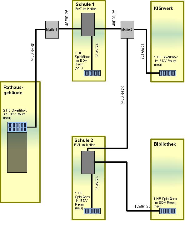 Die Distanz zu den einzelnen Gebäuden bedingt den Einsatz von Monomode Fasern 9/125µm. Alle Einrichtungen werden über E 9/125µm LWL-Kabel an das Rathaus angebunden. Die Verzweigungen zu den einzelnen Einrichtungen erfolgen in Schule 1 und Schule 2 und der Muffe 2. Zwischen Rathaus, Schule 1, Schule 2 und Muffe 2 wird ein Kabel mit 48 Fasern und zwischen Muffe 2 und Schule 2 wird ein Kabel mit 24 Fasern gezogen. In den Schulen 1 und 2 wird zwölf-faseriges Kabel verlegt. Zur Bibliothek und zum Klärwerk wird ebenfalls ein zwölf-faseriges Kabel verwendet. Zum Einsatz kommt ein Innen-Außen-Kabel mit der Bezeichnung U-DQ(ZN)BH...... . Die Kabel werden von einem Tiefbauunternehmen in vorhandene und zu erstellende Rohrsysteme eingeblasen. Zu den zwei Schulen, zur Bibliothek und zum Klärwerk werden neue Rohrsysteme gebaut. Die Wanddurchführungen werden ebenfalls vom Tiefbauunternehmen erstellt. Für die Muffe 1 und 2 sind Kanalschächte vorhanden, die ausreichend Platz für die hinzukommenden Bindung aufweisen. Es werden 3M Muffen für die 48 Spleiße eingesetzt. Abzweigungen sind ebenfalls möglich.